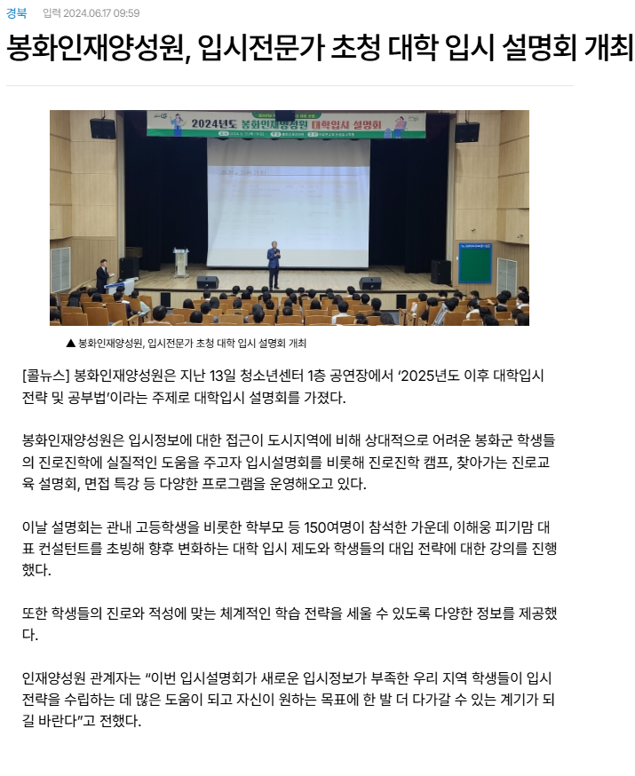 봉화인재양성원, 입시전문가 초청 대학입시 설명회 개최